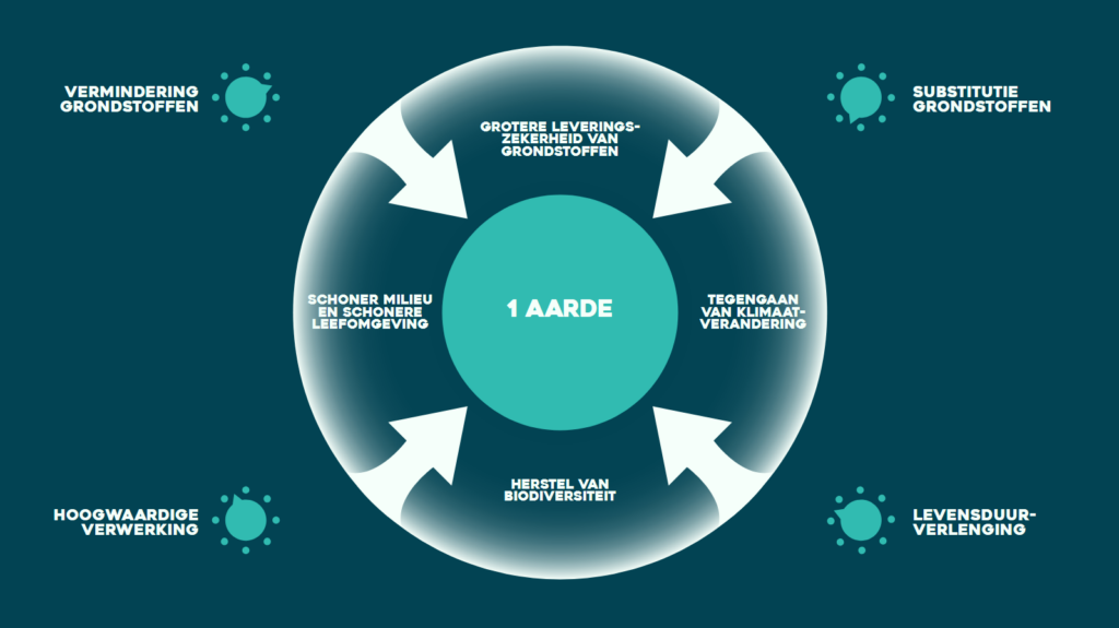 Doel: Nederland wil in 2050 volledig circulair zijn. In 2030 moet het gebruik van primaire grondstoffen (fossiel, mineraal en metaal) gehalveerd zijn ten opzichte van 2016.